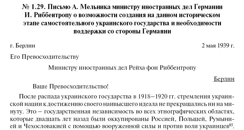*Ситуация в украинских землях в Польше достигла невиданного ранее напряжения. Возможные облегчения ничего не меняют в положении дел, также решение украинской проблемы в виде автономии в рамках польского государства не учитывается после прежних попыток и опытов. Политико-психологические предпосылки для отделения западно-украинских областей от Польши в настоящее время являются тем фактом,* который никто уже не может изменить. Для успешного осуществления такой акции при создании благоприятной внешнеполитической ситуации необходимо только оружие.