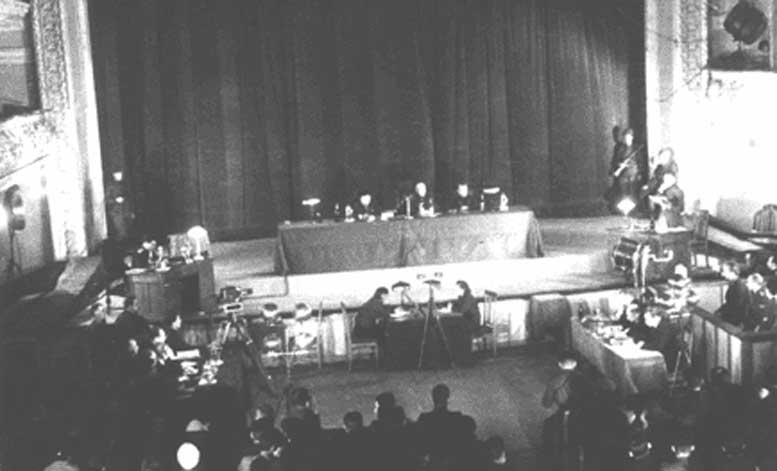 За судейским столом председатель военного трибунала 4-го Украинского фронта генерал-майор юстиции А.Н.Мясников и члены трибунала — полковник юстиции М.А.Харчев и майор юстиции С.С.Запольский. Слева государственный обвинитель полковник юстиции Н.К.Дунаев.